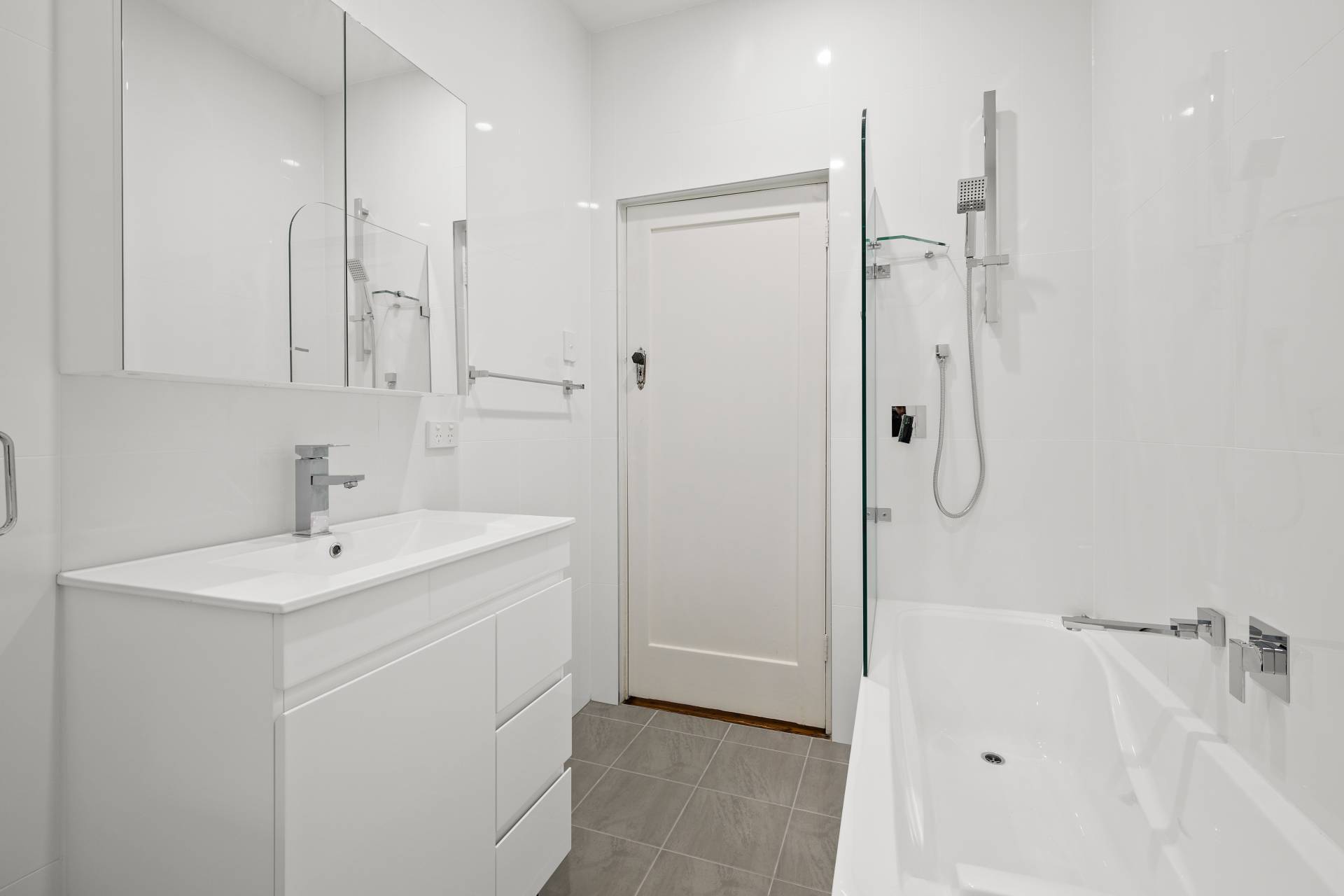 Sleek, modern bathroom with bathtub