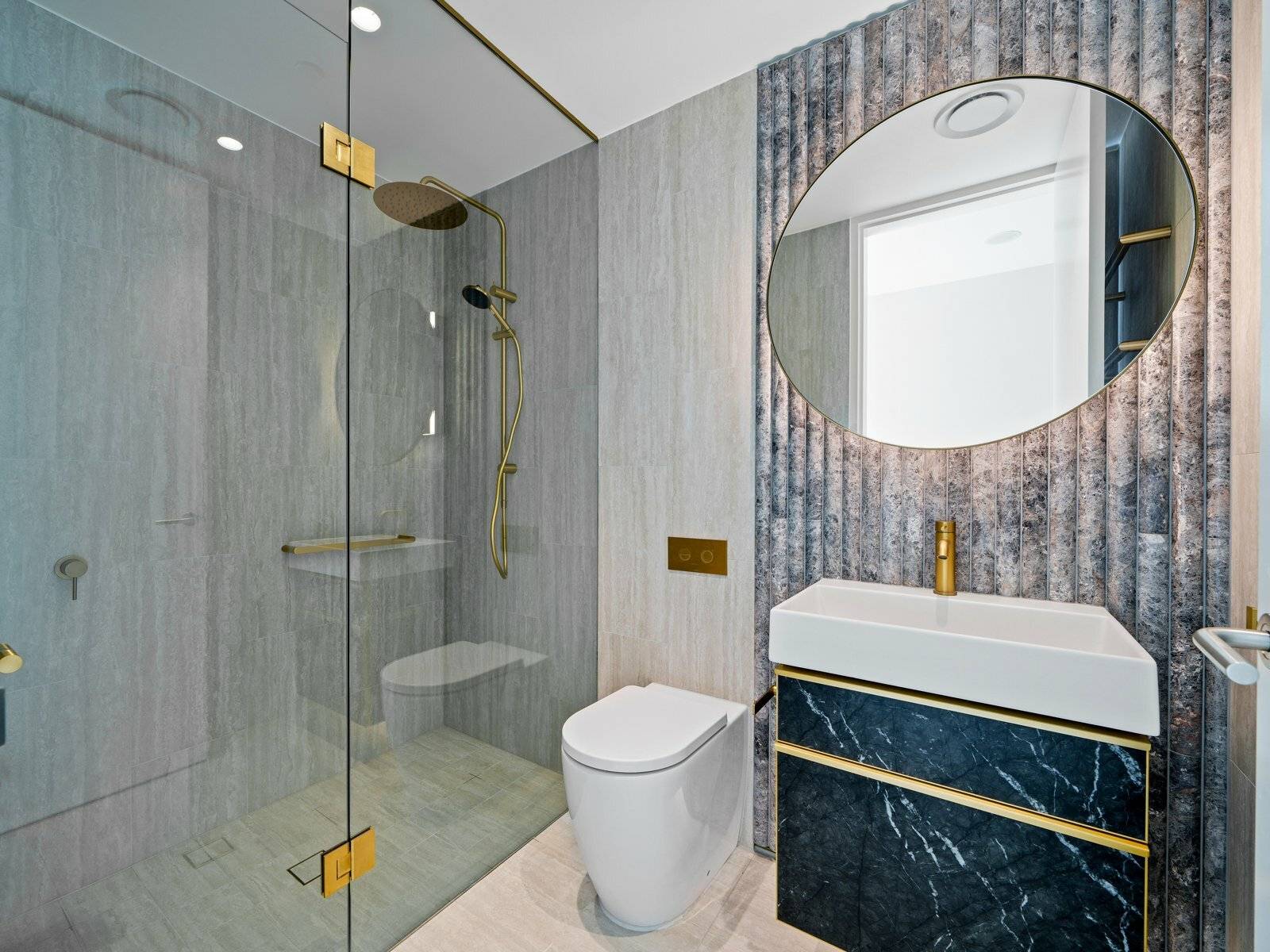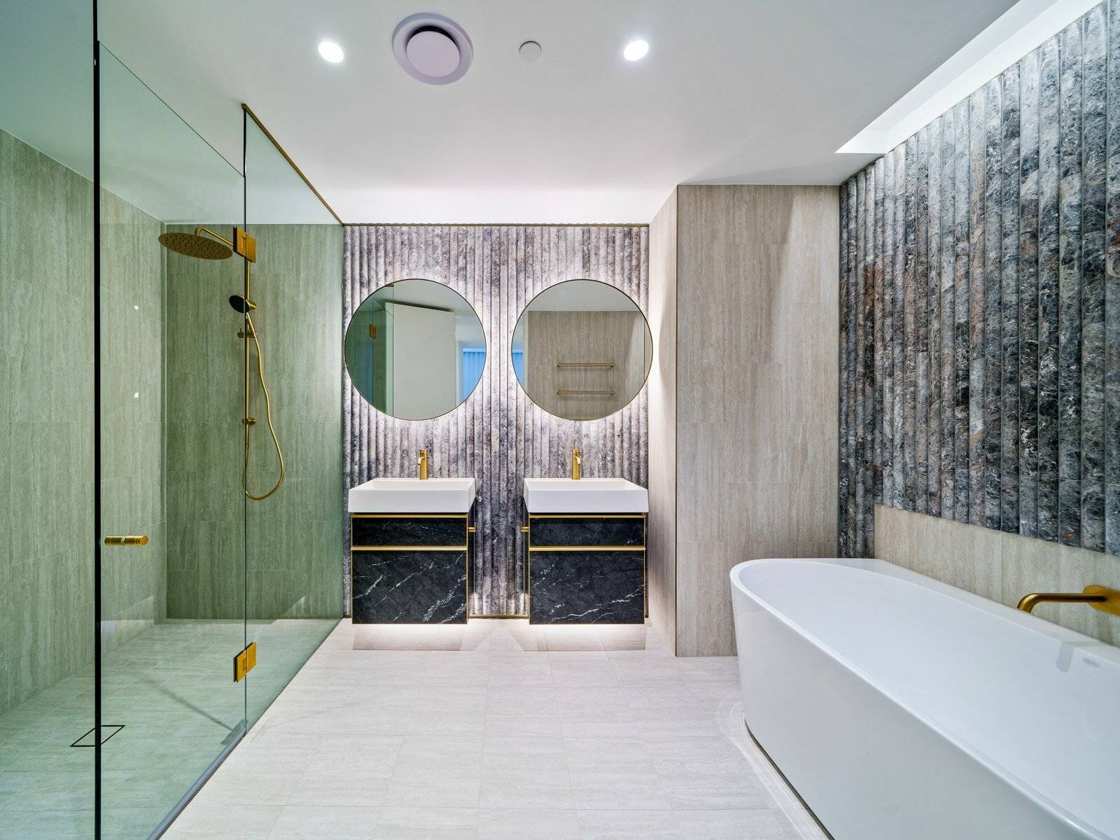 - Luxurious bathrooms, luxury floor and wall tiles mirrored joinery cupboards and semi-frameless glass shower screen