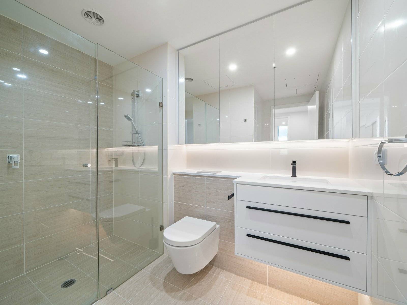• Updated bathrooms feature wall-mounted toilet and frameless showers