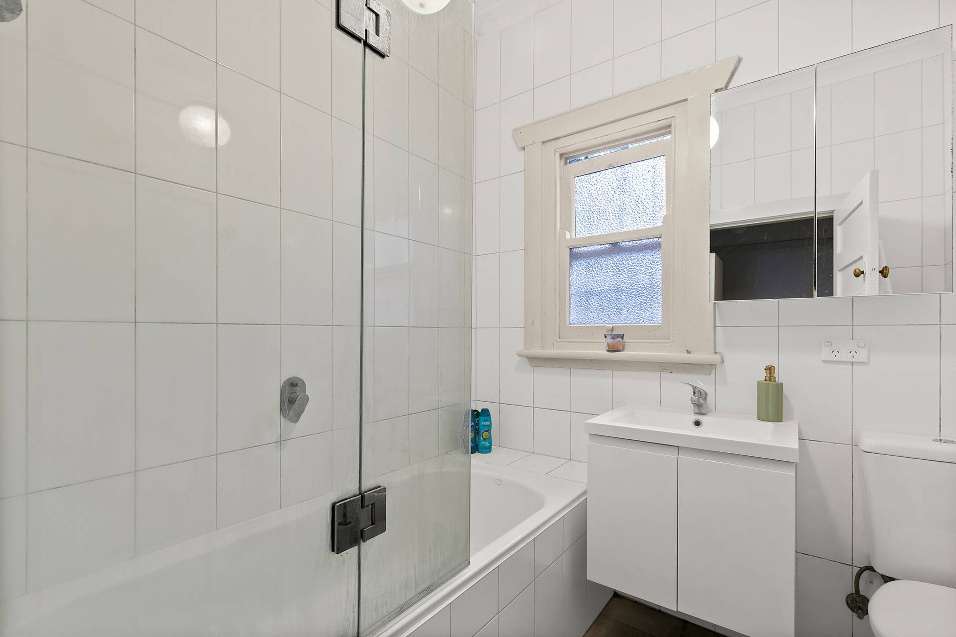 - Modern bathroom with shower over bath