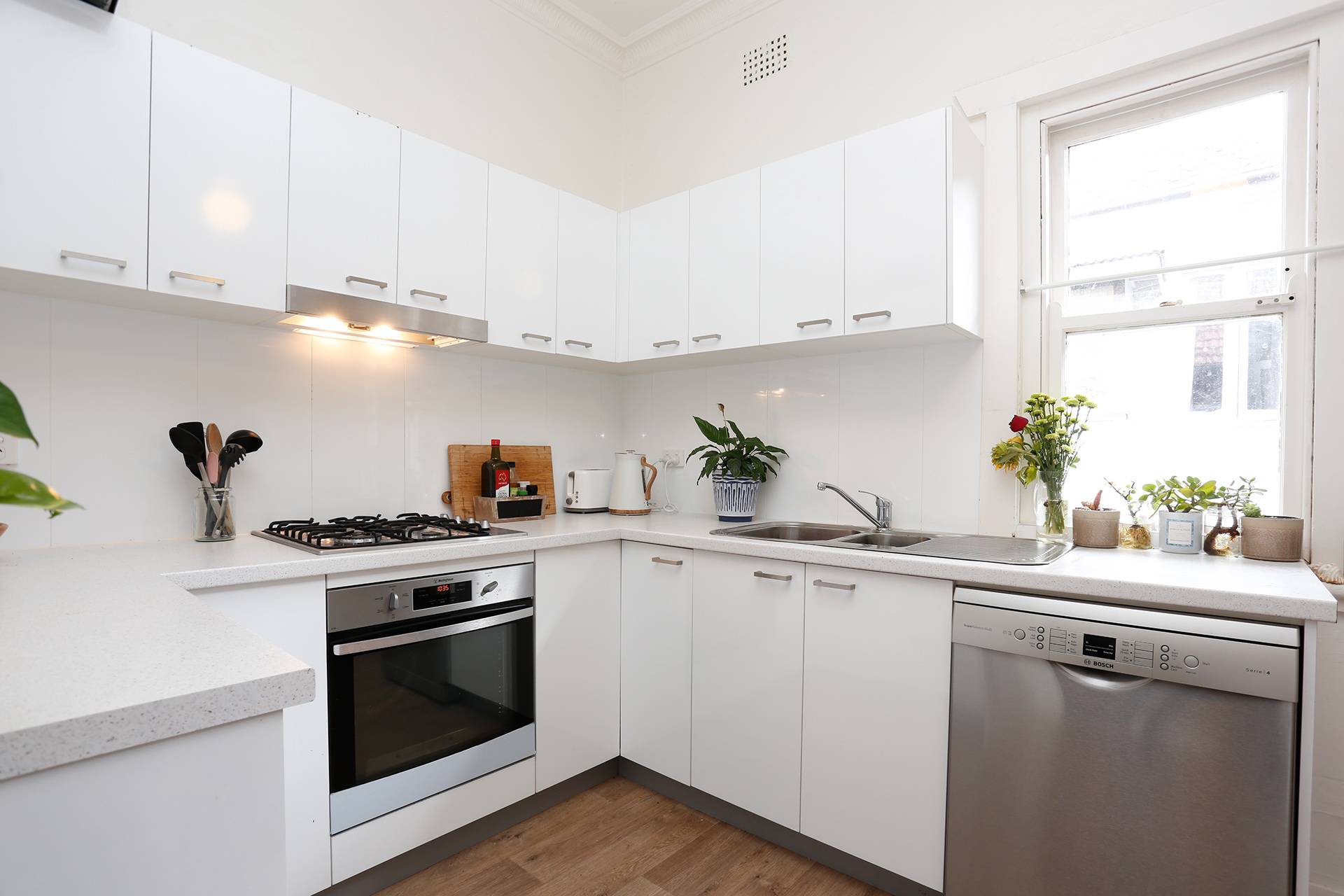 - Separate renovated eat-in kitchen with plenty of storage, gas cooking and dishwasher